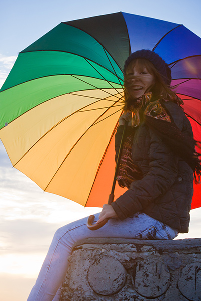 Ключевые слова: зонт, радуга, крыша, девушка, небо